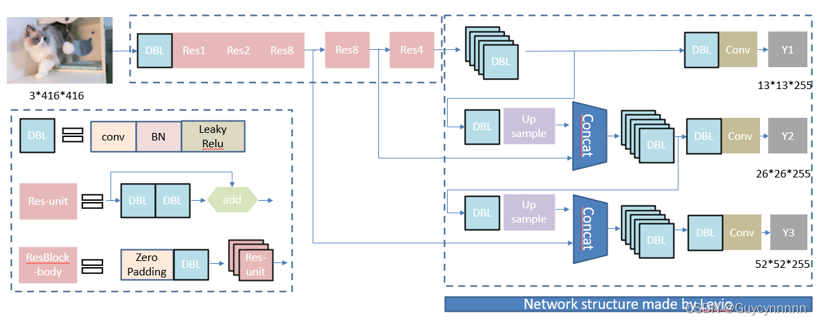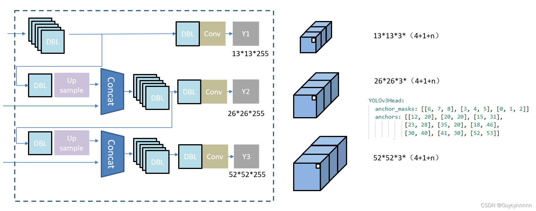 ,小的特征图下采样倍数大,拥有更大的感受野,即每个格子对应的原图的范围更大。用于大目标的检测,大分辨率则用于小目标的检测。通过上采样将深层特征提取,其维度是与将要融合的特征层维度相同的(