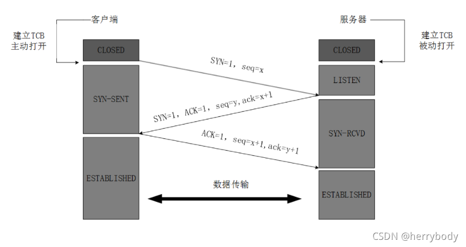 第一次握手:发送端向接收端发送握手请求,发送端表示想创建连接