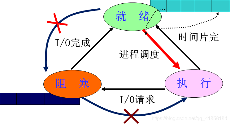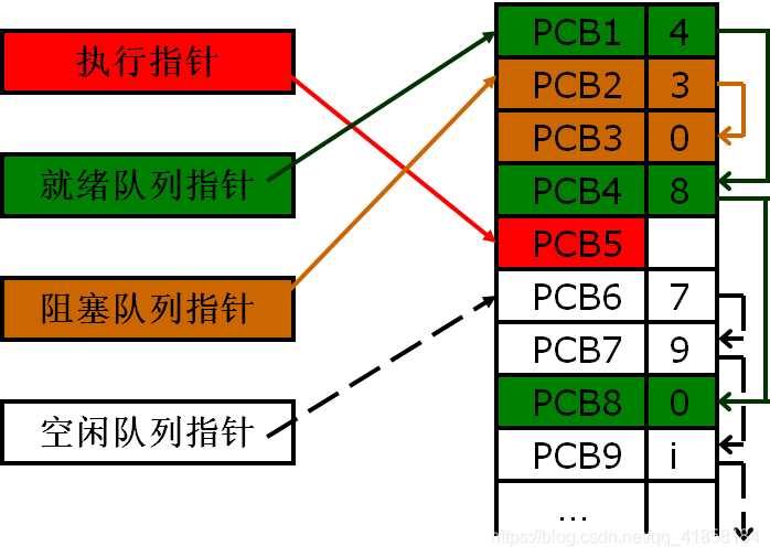 同一状态的PCB,依靠链接指针链接成队列。就绪队列;若干个阻塞队列;