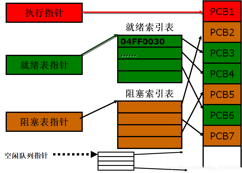 同状态的PCB同样集中记录,但以索引表的方式记录PCB的地址。用专门 的单元记录各索引表的首地址。