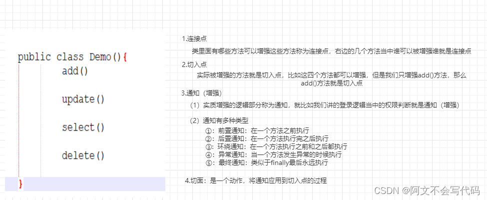 Aspect(切面)– 是 切入点+通知 的结合,以后咱们自己来编写和配置的