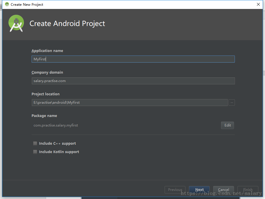 输入工程名称,公司的域名,选择工程的存放位置,注意包名默认为公司域名+工程名称,点击edit按钮,可以进行修改。