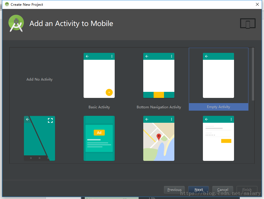 点击Next,添加一个Activity,我们选择添加空白Activity,如下图所示: