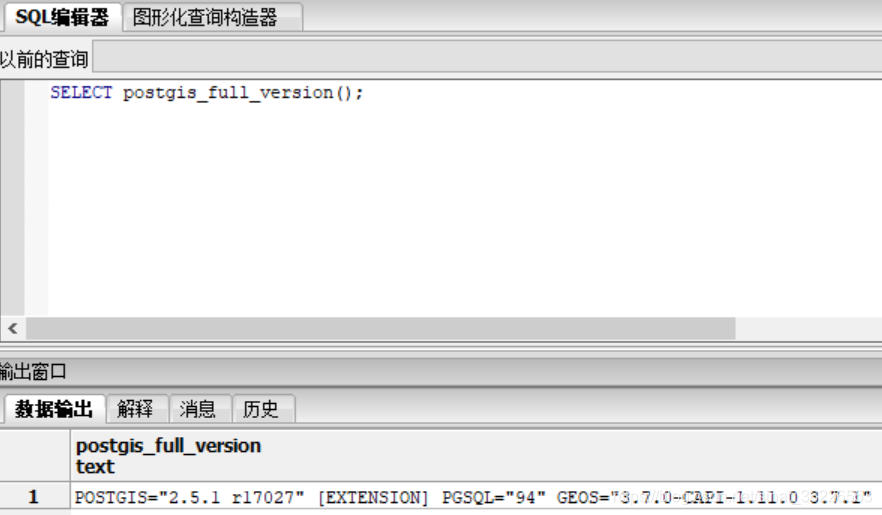 4. 菜单栏打开SQL编辑器,通过运行PostGIS函数确认是否成功创建空间数据库
