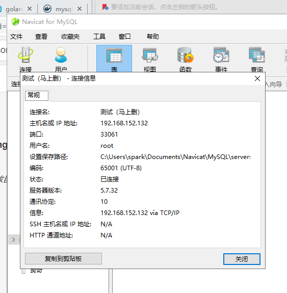 navicat测试连接:宿主机IP地址;33061端口; 账户root;密码root