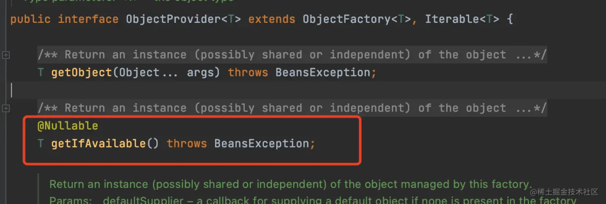 但是ObjectProvider额外提供的getIfAvailable方法就支持获取不存在的对象的功能,当通过getIfAvailable获取的对象不存在时,只会返回null,并不会出抛异常。