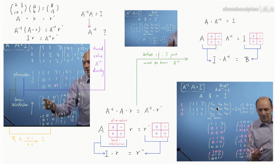 看上图左上方,如果已知A矩阵乘以r矩阵得到结果r’,求 r 矩阵中向量a、b、c的值,可以在左右两边同乘以A的逆矩阵