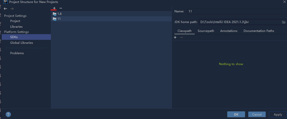 如果 Project 下拉框中没有需要的JDK,可以在下面的 SDKs 中手动添加