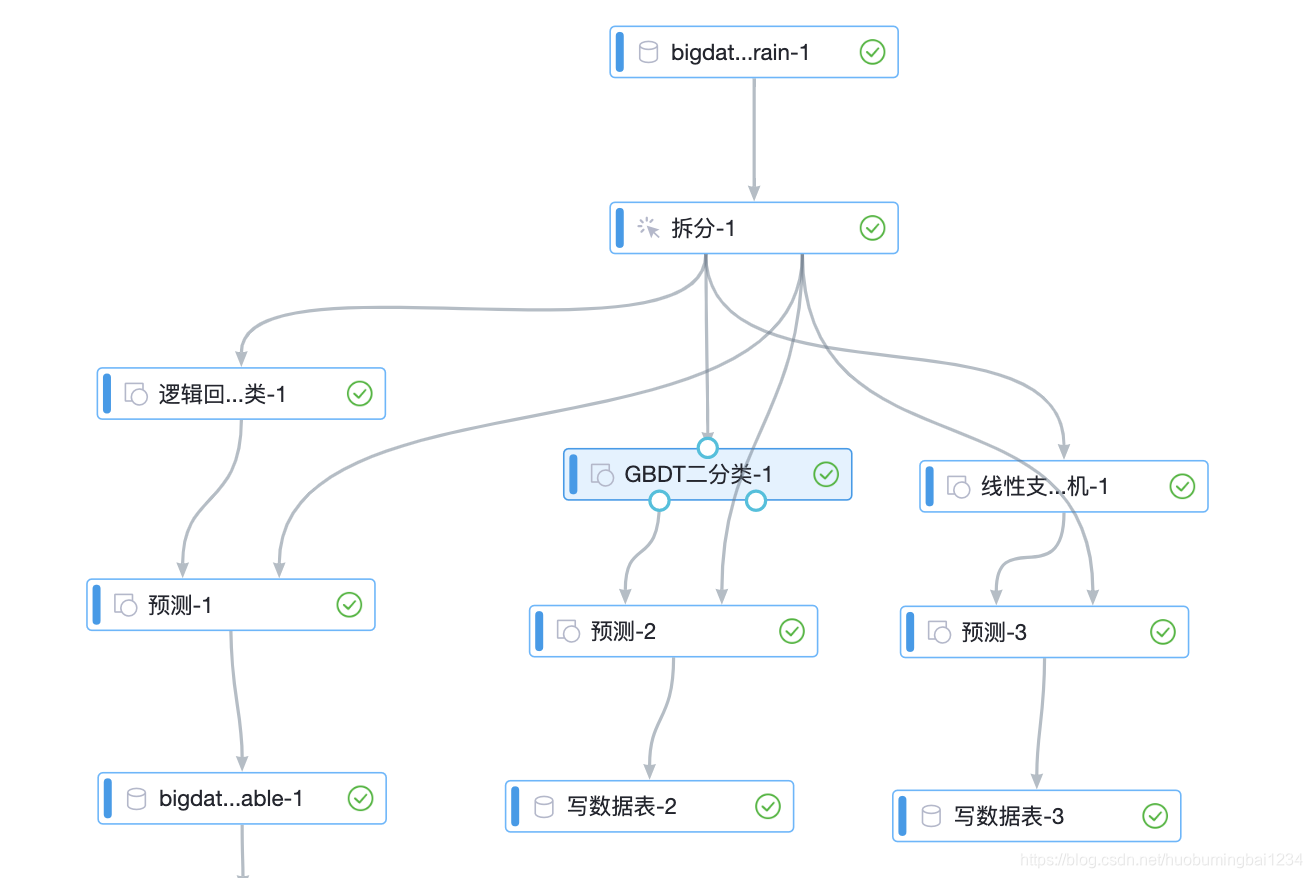 pai的流程还是很简单,和自己写代码差不多,先分测试数据和预测数据,训练模型,预测结果,看结果好坏,直接训练3个模型,流程如下: