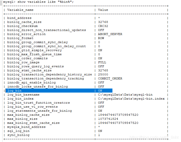 2、查看binlog是否开启:show variables like “%bin%”; ,如果是OFF代表是关闭,ON代表开启