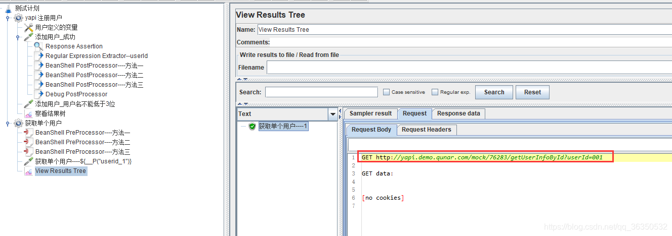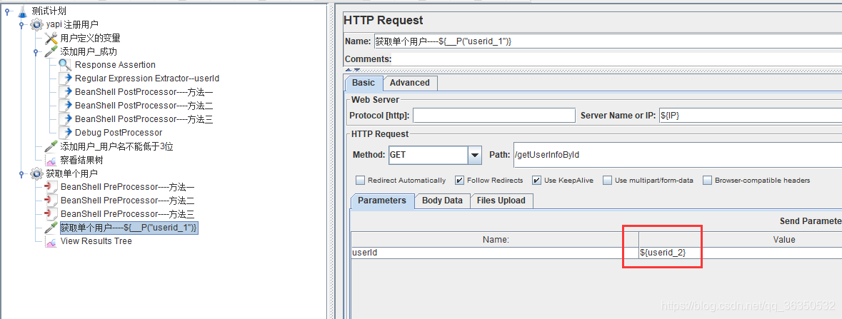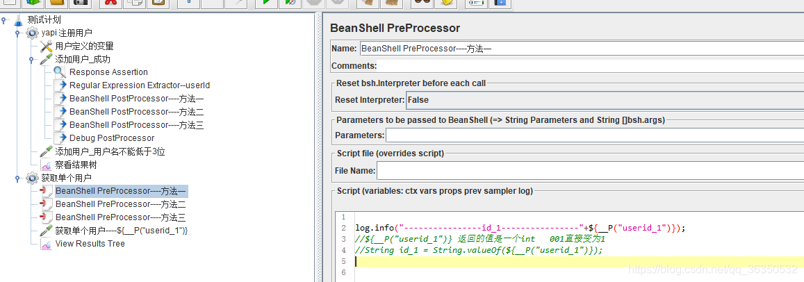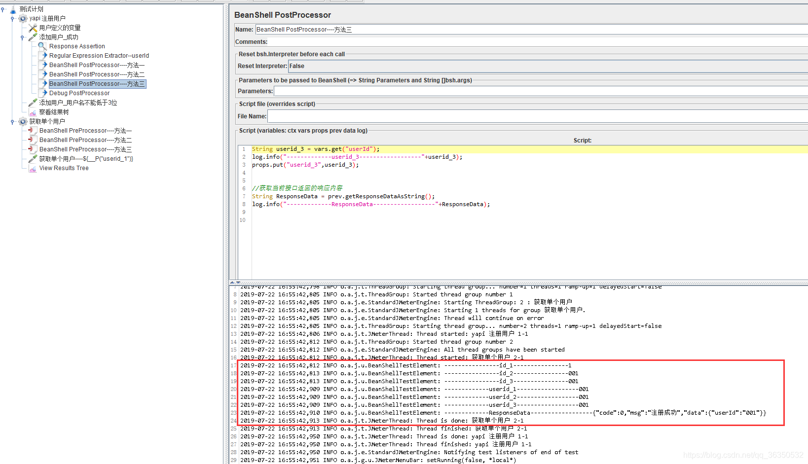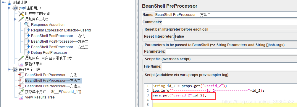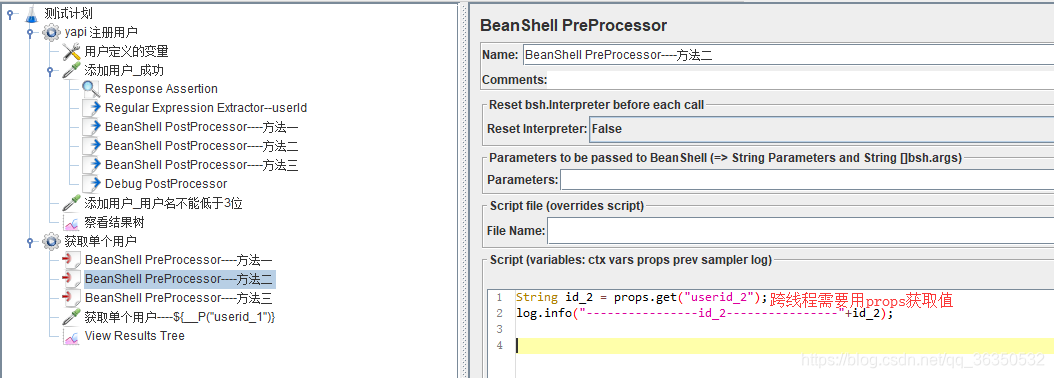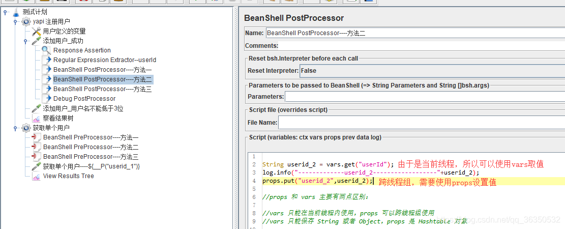 注:在第二个线程组中,我使用的是 BeanShell前置处理器BeanShell PreProcessor进行的取值,获取到值后,可以使用vars函数进行设置值,在HTTP request 中使用。