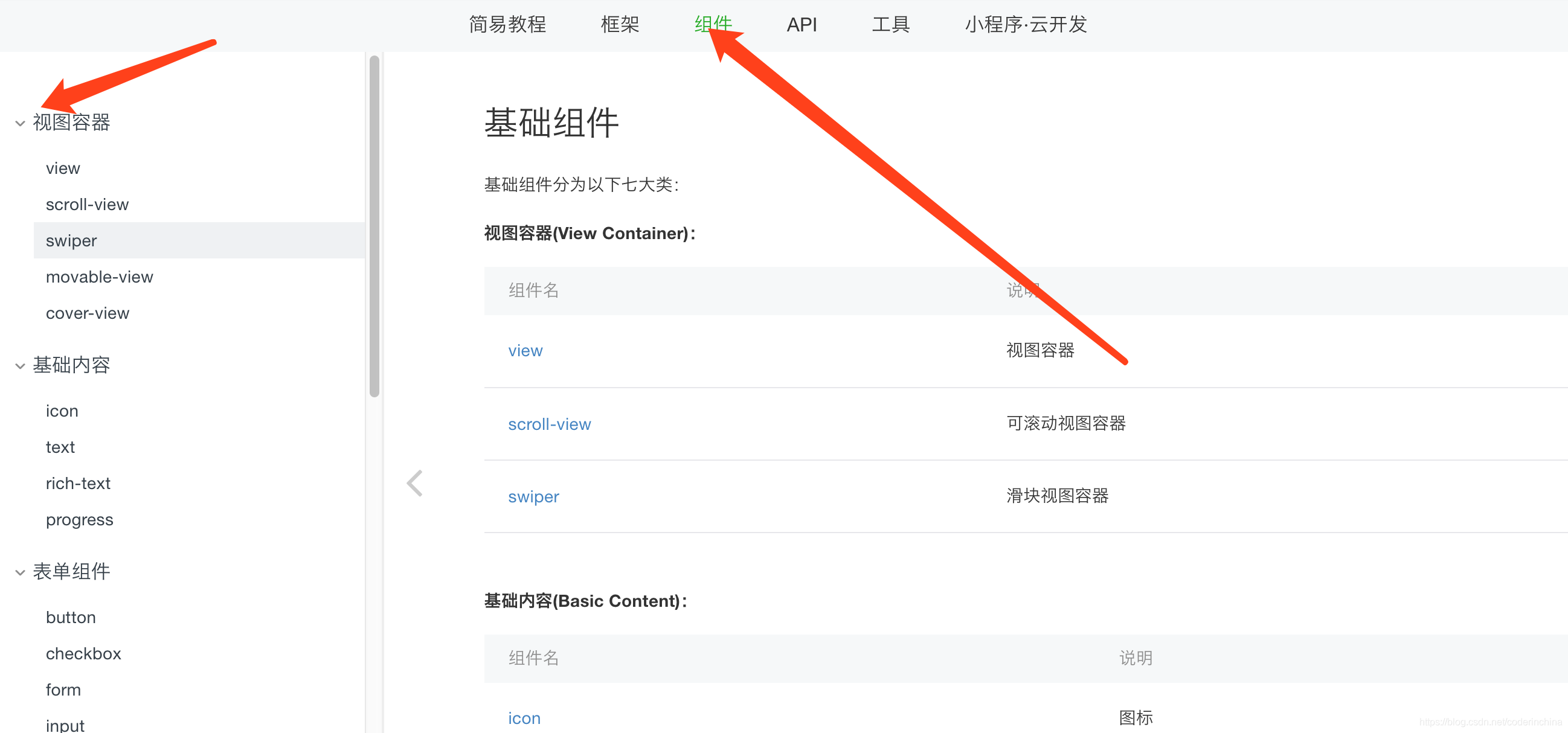 swiper这个标签来实现的,我们在微信小程序文档中可以查看所有的标签,如图: