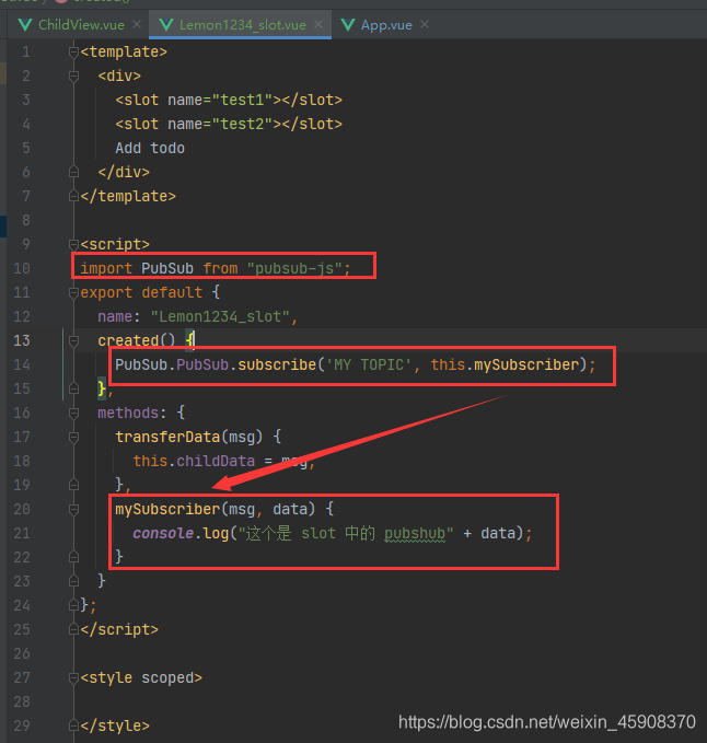 接下来我们将 pubsub 在我们 App.vue 中引入一下,这里我们要做的是做订阅消息。来看一下代码