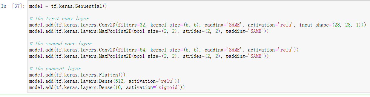 两个卷积层, 接下来两个全连接层,在添加全连层之前 需要先对数据添加扁平化处理,将多维数据拉直成一维的,即Flatten()的作用。