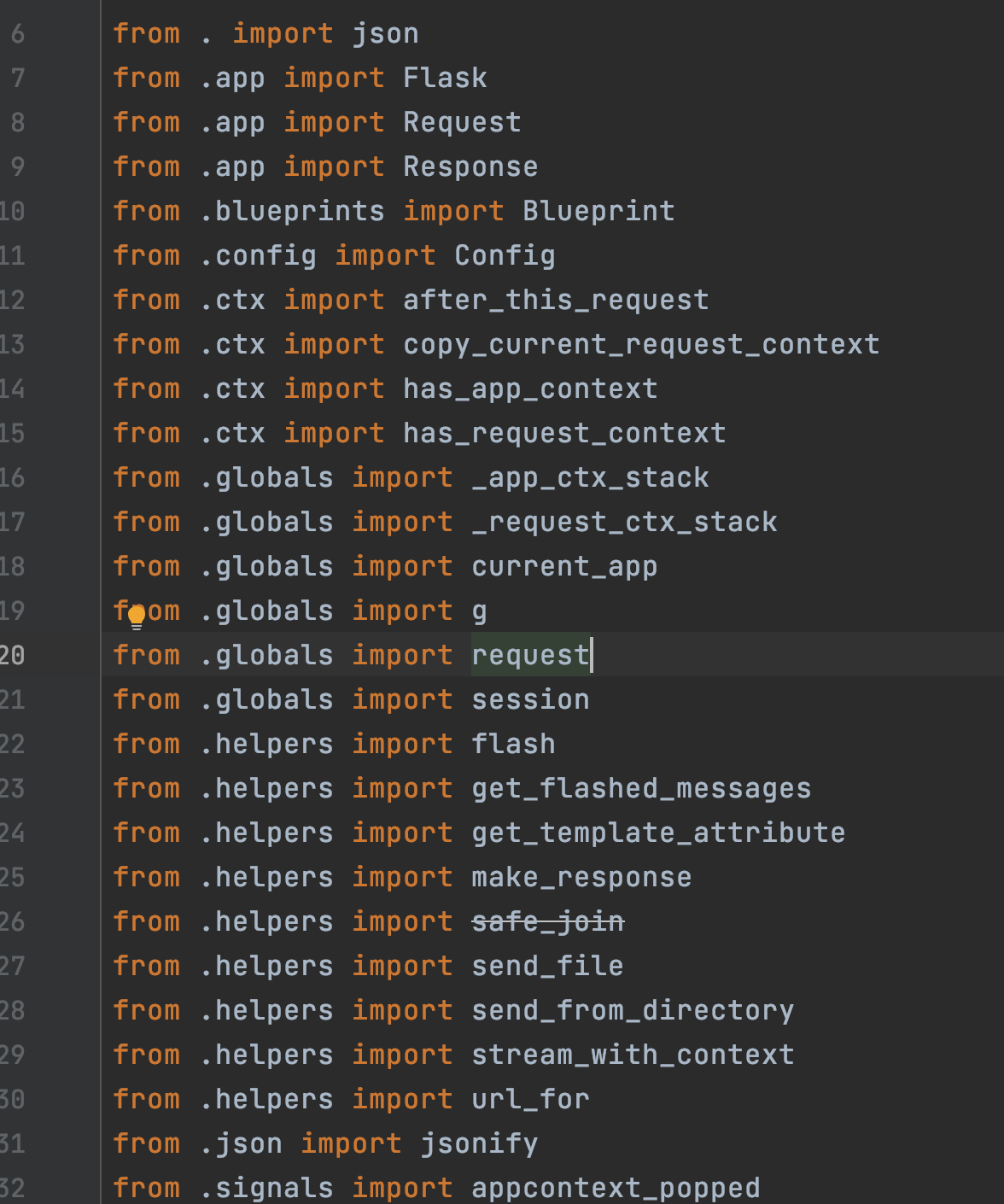 globals.py: 定义全局变量, 比如request, session等(都是代理对象提升为全局变量, 不会修改原对象)