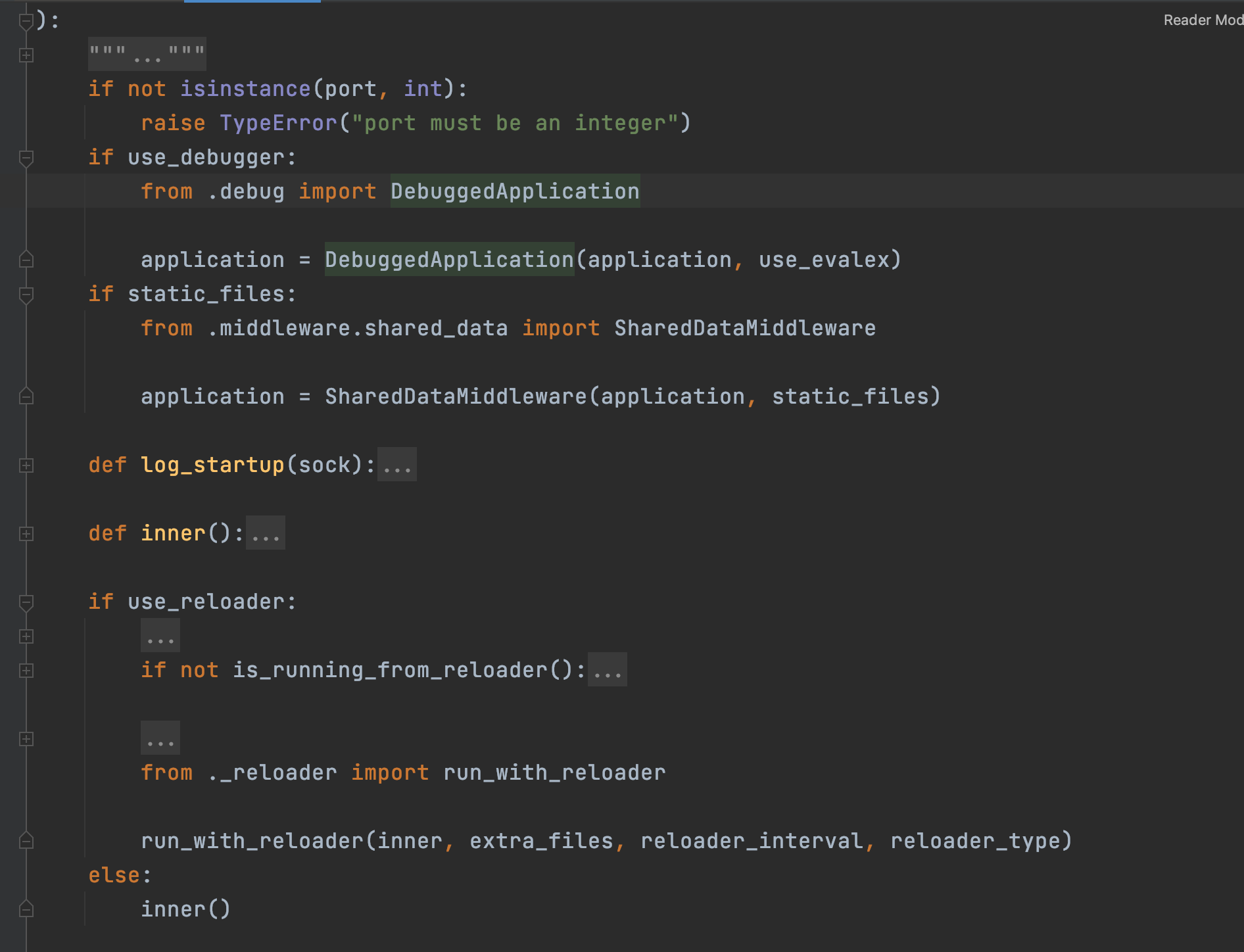 run_simple函数中, 如果开启debug, 会通过DebuggedApplication为程序添加调试功能. 如果static_file是True, 同样使用中间件提供静态文件功能