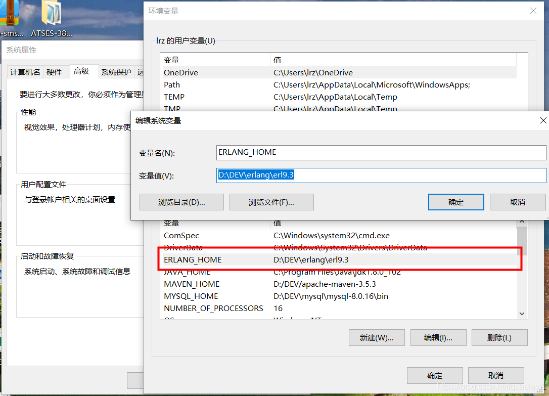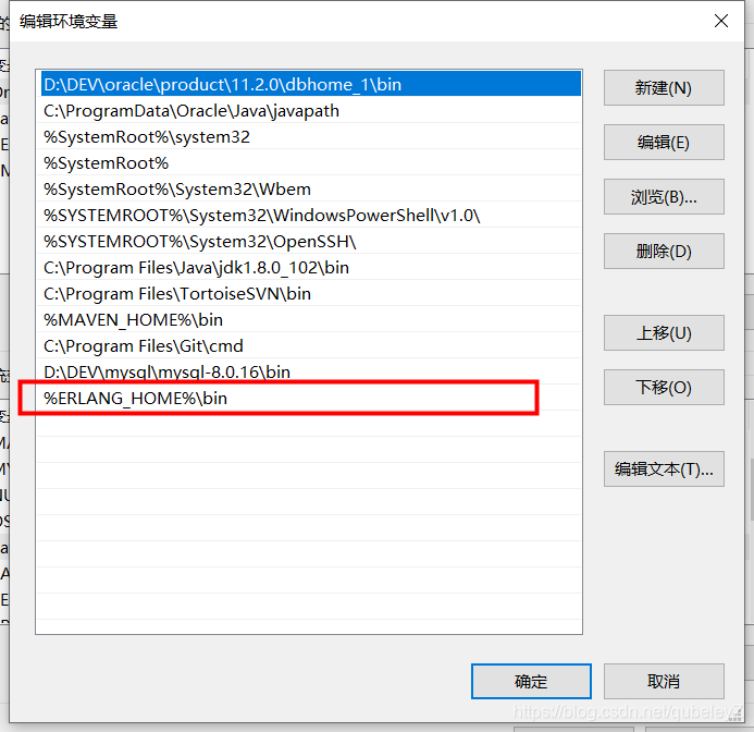 安装好之后,打开电脑环境变量配置。配置ERLANG_HOME。