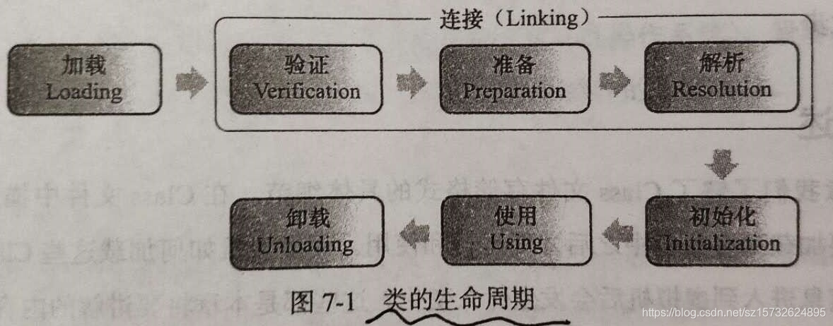 类从被加载到虚拟机内存中开始,到卸载出内存为止,它的整个生命周期包括:加载(Loading)、验证(Verification)、准备(Preparation)、解析(Resolution)、初始化(Initialization)、使用(Using)和卸载(Unloading)7个阶段。其中验证、准备、解析3个部分统称为连接(Linking)。这7个阶段的发生顺序如图: