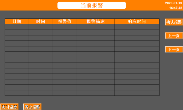 进入“当前报警”界面,显示的是当前告警发生情况,如图3.4;若要查看所有历史告警,进入“历史报警”界面。在“当前报警”界面查看实时发生的报警,有报警时,此界面显示出报警提示,并且蜂鸣器鸣叫,在蜂鸣器鸣叫时,点击确认报警,蜂鸣器会停止鸣叫,同时报警提示的字颜色会变为蓝色,当报警故障消除后,报警提示会消失。