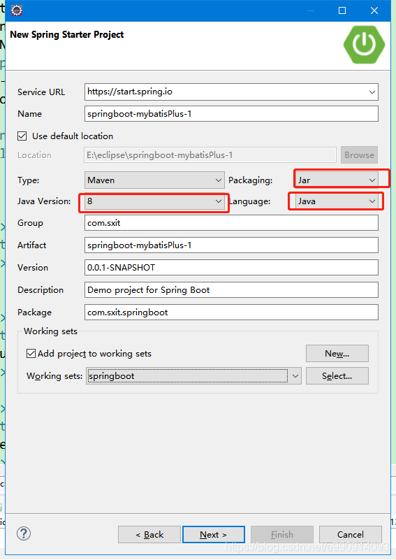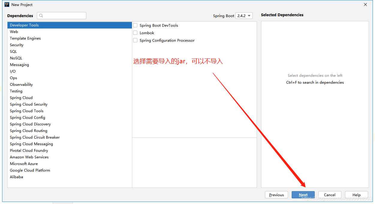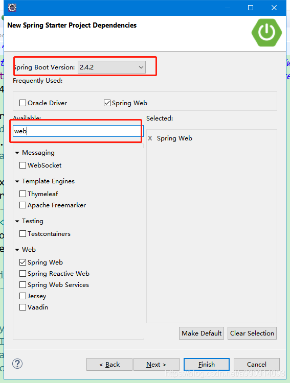 3、选择导入的springboot版本以及所需jar,可以省略此步骤,点击finish