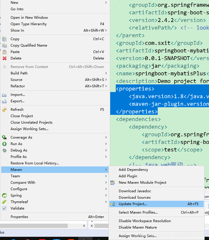 4、eclipse创建的SpringBoot项目pom.xml的第一行也许会报错,加上以下代码,之后选中项目右键,maven–》update project