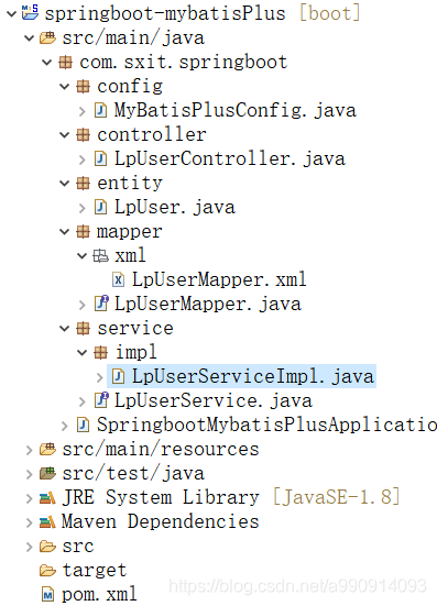 6、如图所示,创建config包(自定义组件类,修改或者添加springboot的组件),controller包,entity包,mapper包,service包,自然,在src/main/java包下的任意目录下创建都可