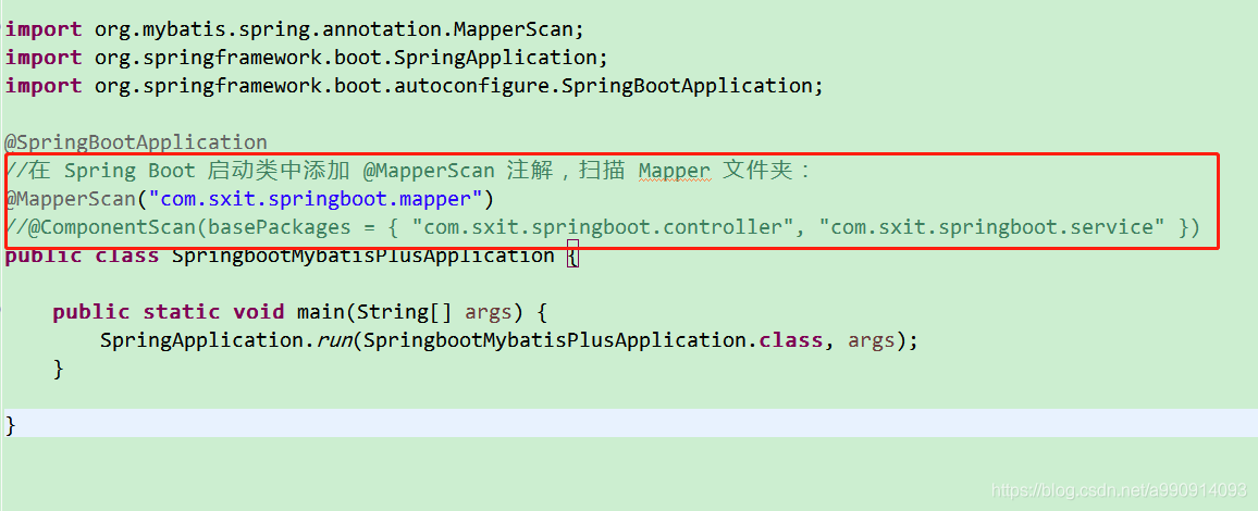 7、打开SpringBoot启动类(类名都带**Application.java),在@SpringBootApplication 下添加 @MapperScan 和 @ComponentScan 注解,其中@MapperScan 是告知SpringBoot mapper接口所在位置