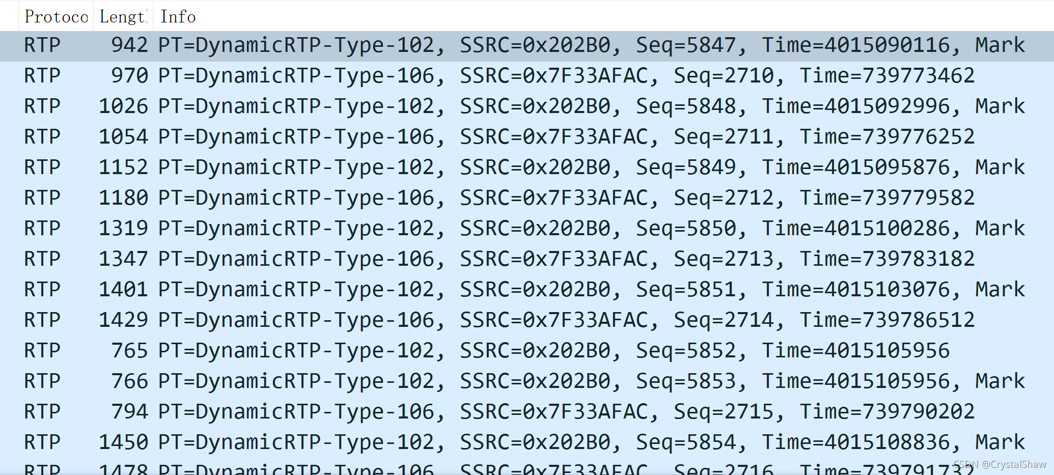 发送FlexFEC报文的时候,是同时发送两股流:PT值为102的正常媒体报文。PT值为106的flexfec冗余报文。这两股流使用的是不同的SSRC 。