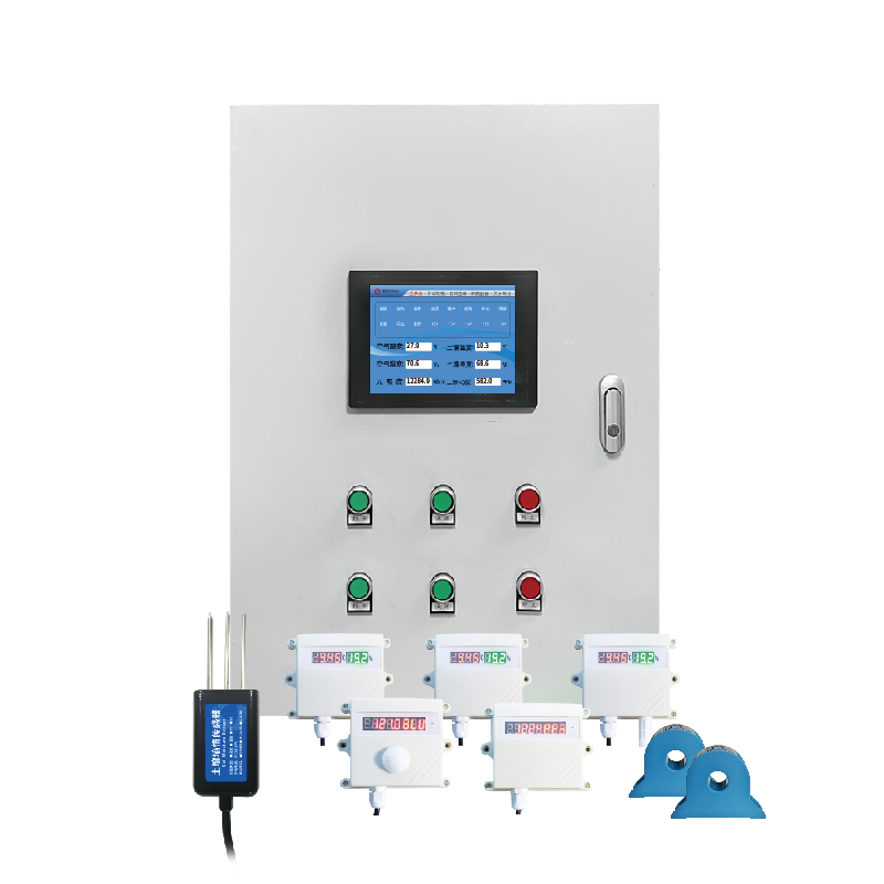 控制箱集成了触摸屏一体显示控制,可现场显示实际传感器数据,如温湿度、光照度、CO2等。并可现场触摸控制实际输出设备,如风机,卷帘、刮粪机等。