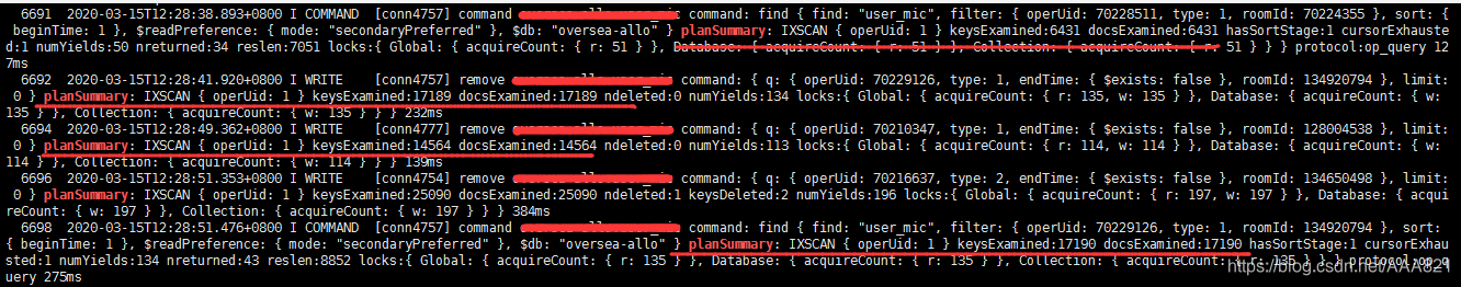 通过查询日志 PlanSummay:IXSCAN{operUid:1} 表示它有用到operUid索引,通过keysExamined跟docsExamined可以知道,索引到的数据量很大,都是1万条多条。