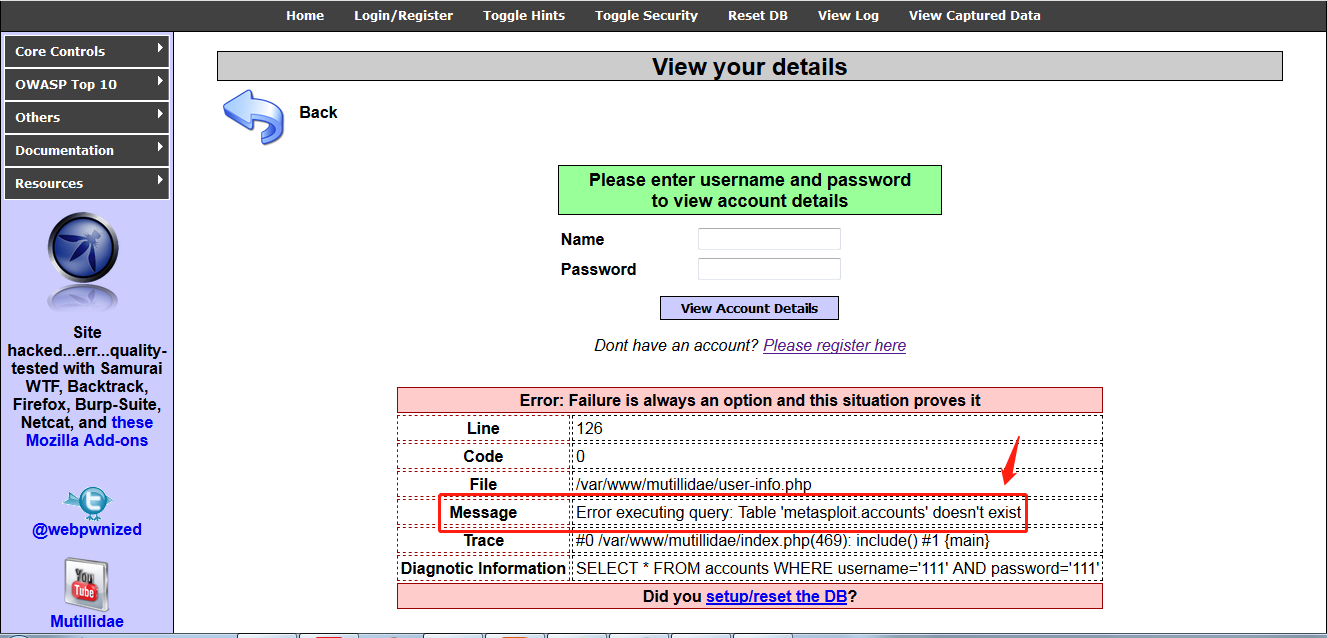 在使用metasploitable2进行SQL注入时,发现了如下的问题,Table ‘metasploit.accounts’ doesn’t exit;
