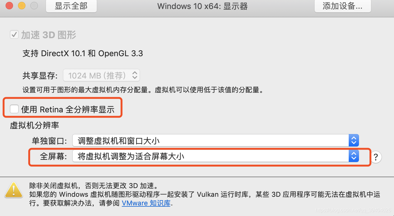 2.将”使用Retina全分辨率显示”的√ 去掉,将下面全屏幕改成:”将虚拟机调整为适合屏幕大小”