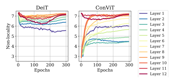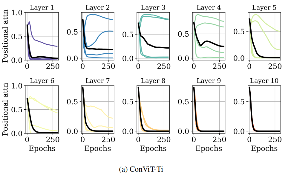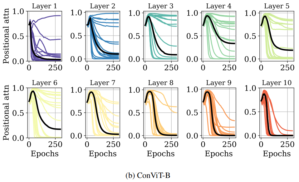 )的值。黑线代表8个注意力头值的平均数。作者用ConViT-S在ImageNet上训练了300 epochs。