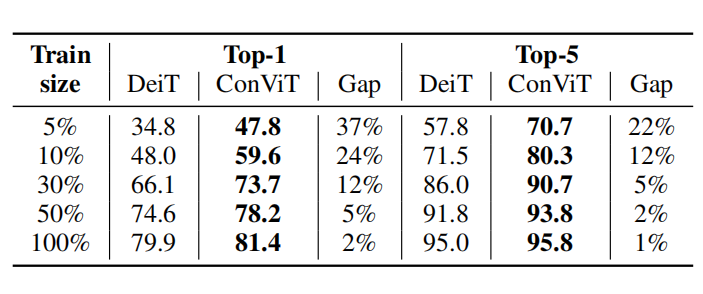 在ImageNet数据集上训练300个次epoch的训练结果。同样的条件下ConViT都要超过DeiT的结果。