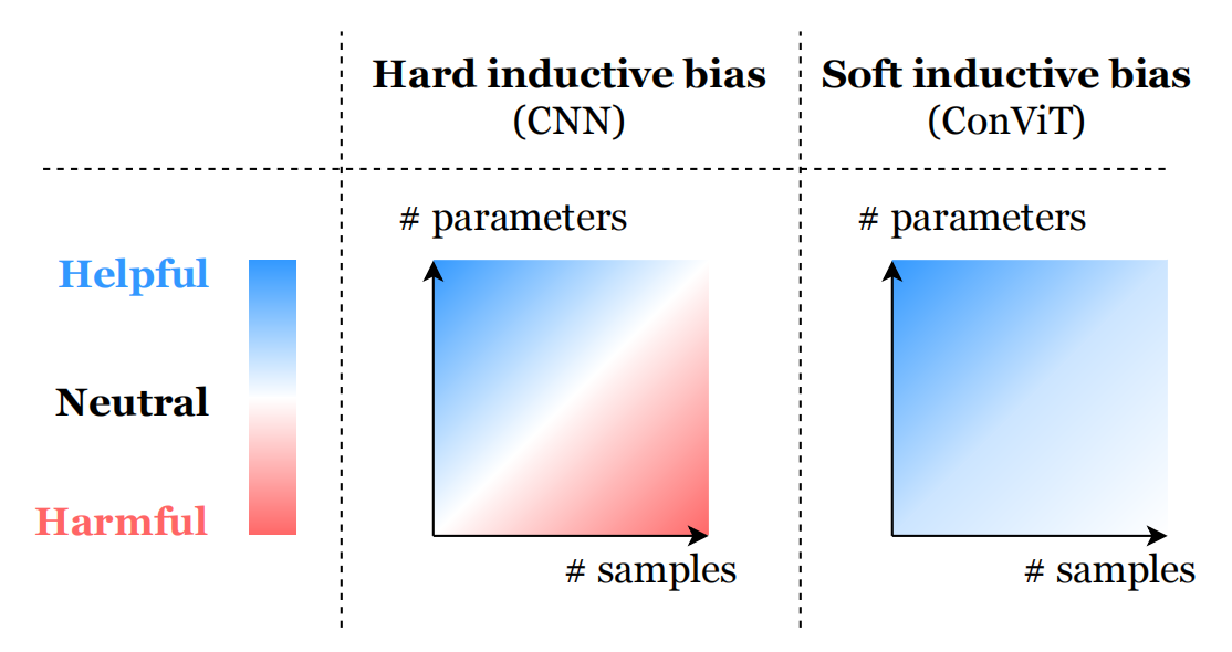 图1中,红色部分表示没用的信息,左边的硬归纳偏置对有用信息和没用信息有着清楚的分割,而右边的软归纳偏置是柔和的进行数据的分析。软归纳偏置可以拒绝模型的上限问题。像CNN这种的硬归纳偏置结构,可以有效地利用数据,但是当数据集大小没有限制,可以获得无限大的数据集时,这种硬的归纳偏置是有上限的。ConVit提出的软归纳偏置意思是,当数据量足够大,不需要归纳偏置的时候,是可以自动消失的,利用这种办法来去掉硬归纳偏置的上限的限制。