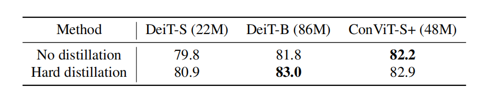 同样的,ConViT也可以使用知识蒸馏,使用硬蒸馏效果提升明显,如下表所示: