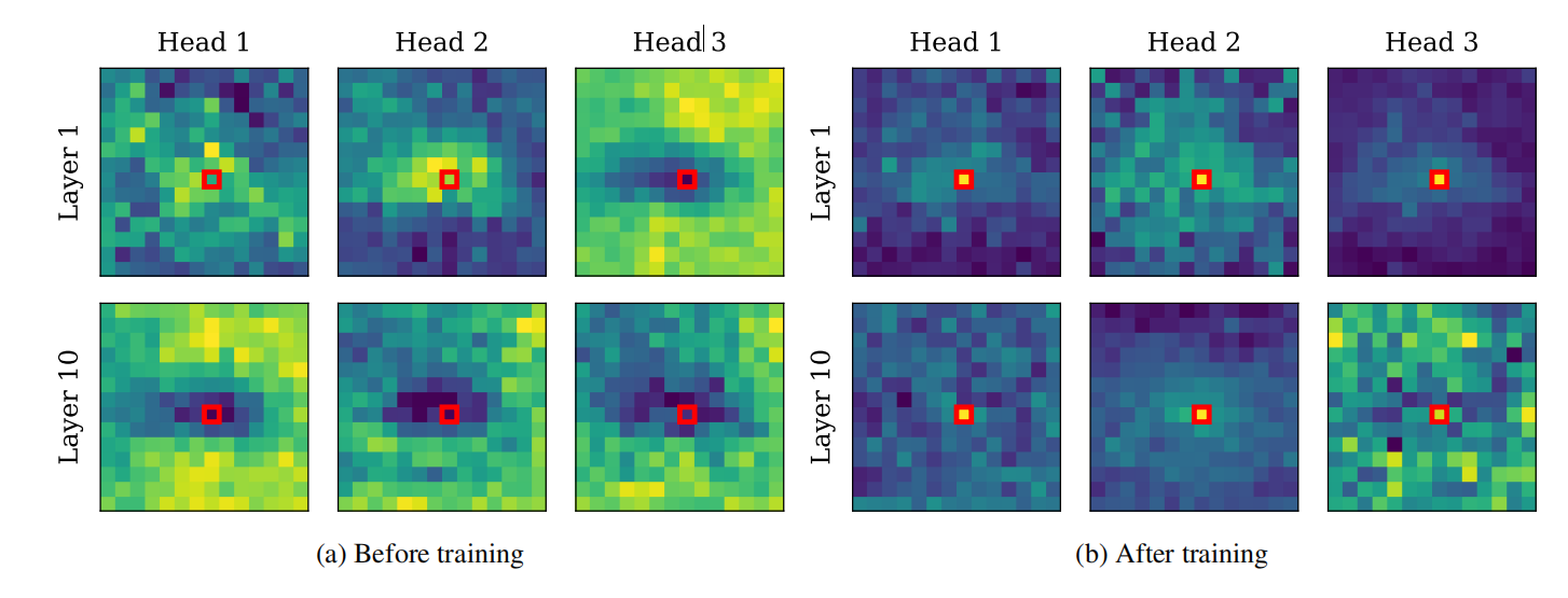 上图中,揭示了DeiT训练结束时的平均注意力图的位置信息。为了更好地看到注意力的中心,作者平均了100多张图像的注意力图。作者给出了一些可视化的证据,将普通SA层通过平均100多张图像,让DeiT的第一层和第十层的注意力特征图提取局部信息。训练开始前,图15(a)图像看起来是随机的。但是在训练后图15(b)Layer1看起来是查询像素及其周围的信息,而Layer10则是捕获到了全局的相关性。看一看出来SA在开始的浅层网络还是想去收集局部信息,但是最后并没有成功,最后依然是全局信息。