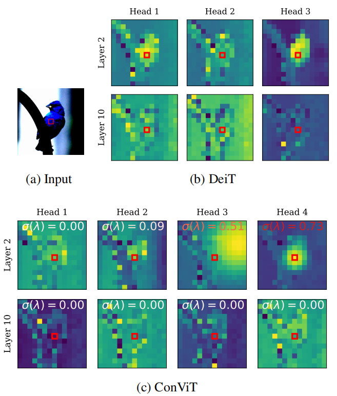 )值,说明利用位置信息其实起着关键作用。作者发现,ConViT-Ti只使用位置信息到第4层,而ConViT-B使用位置信息到第6层,如下图(a)(b)所示,表明可能更大的模型从类卷积初始化的收益更少。