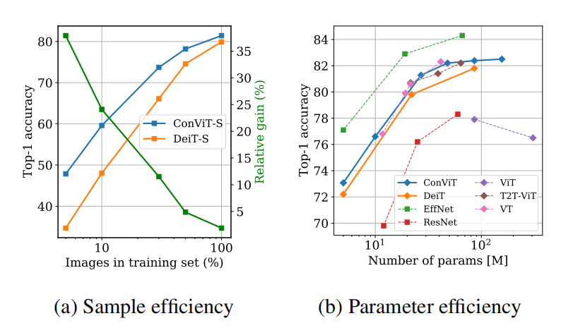 通过图2可以看出,ConVit无论在同样的数据集下还是同样的参数下,都要优于VIT。左侧图:作者通过在ImageNet-1k的部分数据训练ConViT-S和DeiT-S的样本利用率进行比较,其中只保留每个类别图像的一部分作为数据集。两个模型都使用了‘