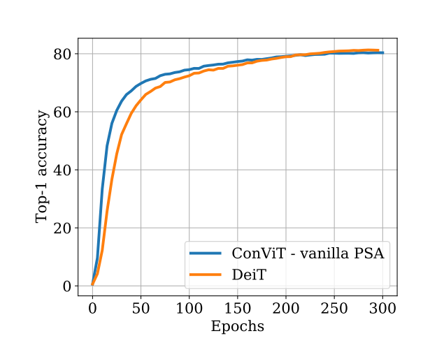 作者使用了ConVit-B模型训练了300个epoch在ImageNet数据集上,但是只用了标准的PSA,没有使用GPSA。在训练早期,PSA的卷积初始化仍然使ConViT比DeiT基线有很大的优势。但是随着训练,ConVit依然使用这PSA的卷积初始化并且忽视了内容信息。到了训练后期,Deti利用内容信息,准确率已经超过了ConVit。
