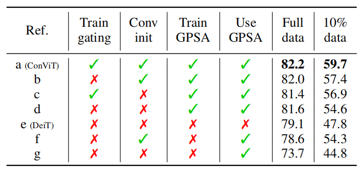 作者做了一些消融实验,如表3所示,ConViT用a表示。移除位置信息关注的版本记为b。用类似卷积初始化记为c。门控参数和类卷积初始化都用的是d。全部去掉的记为e,与DeiT一样了。