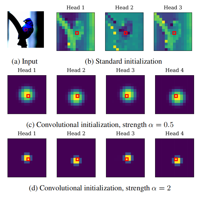 位置自注意力层可以像卷积操作一样初始化。图3中,(a):来自ImageNet的输入图像,其中查询patches的位置用红色框表示。图3中,b表示未经过预处理的SA层,c和d分别是参数a=0.5和a=2的局部强度参数利用公式5像卷积操作一样进行初始化。注意,当仅仅关注纯粹的位置信息时,图像的内容可以很容易地在(b)中分辨出来,但在(c)或(d)中很难分辨出来。