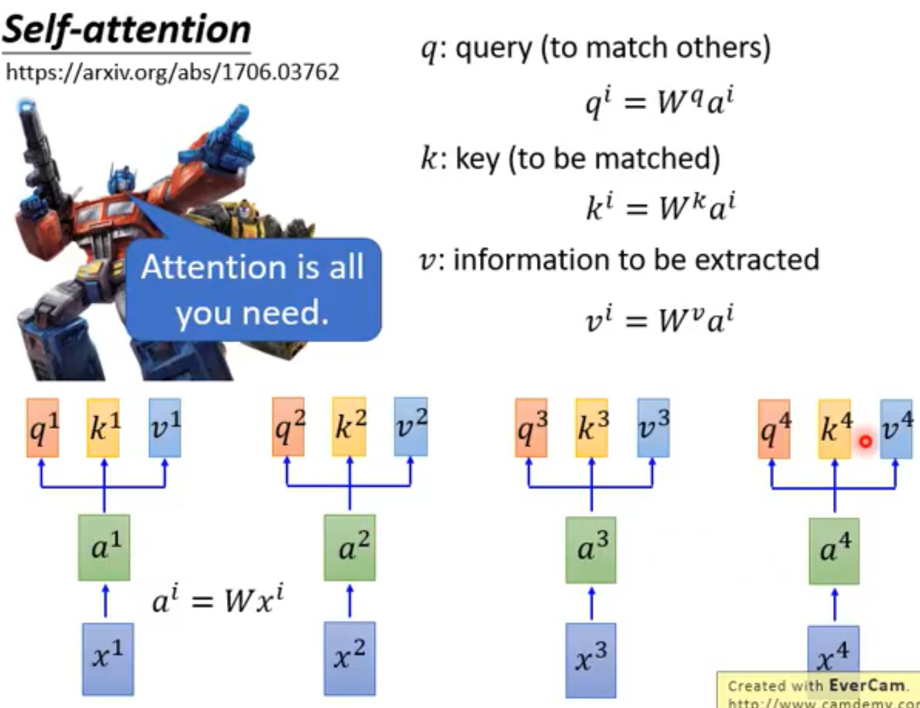 自注意模型引入了3个变量q,k,v。q是用来对其他的k进行匹配的,k是用来被其他q匹配的,这两个值用来计算注意力系数