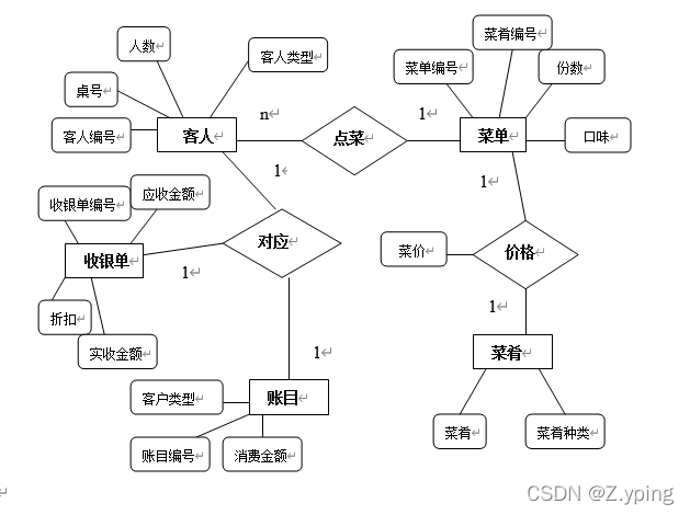 客人  属性有客人编号、桌号、人数、到达时间、客人类型