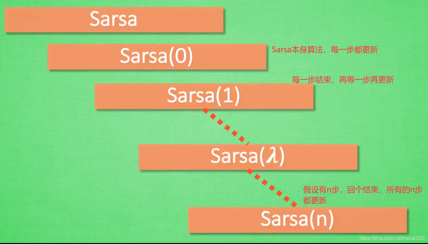Sarsa(λ) 算法:(假设λ=n,n为所有步的步数)