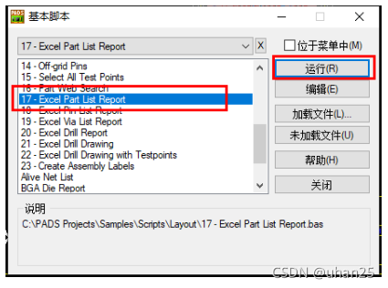 方法一:菜单栏【工具】→ 【基本脚本】→【基本脚本】,选择“17-Excel Part List Report”,点击【运行】,即生成坐标文件。