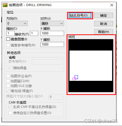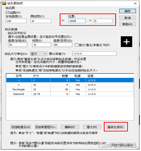 图标,观察预览窗口的图是否有交叉,若有交叉,则点击【钻孔符号】,更改位置X Y 的值,再点击【重新生成】,若无交叉,则无需更改位置 X Y 的值,但仍需要点击【重新生成】。