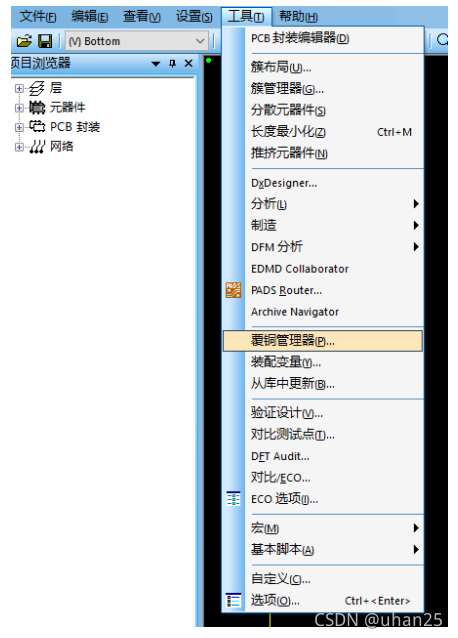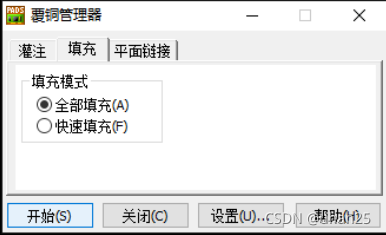 执行菜单命令【工具】→【覆铜管理器】,在“覆铜管理器”对话框中,选择【填充】→【全部填充】,点击开始。
