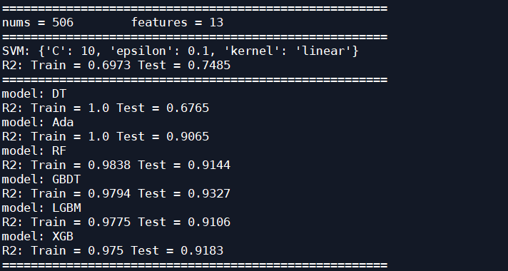 print(‘model: {}\nR2: Train = {} Test = {}’.format(model,train_r2,test_r2))