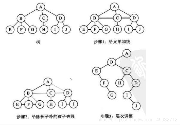 (2)去线。树中的每个结点,只保留它与第一个孩子结点的连线,删除它与其它孩子结点之间的连线。